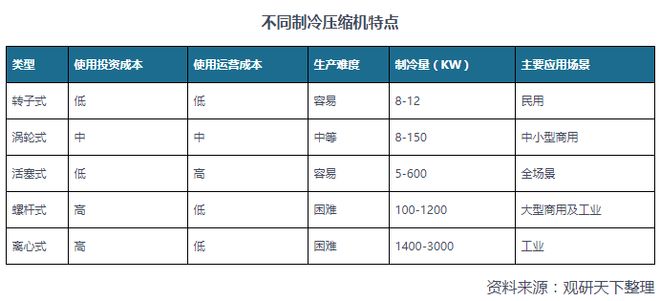 A estrutura dos compressores de refrigeração é dividida em cinco categorias, que podem ser amplamente utilizadas em cenários domésticos, comerciais e industriais. Os compressores de refrigeração podem ser divididos em cinco categorias de acordo com sua estrutura: tipo rotor, tipo vórtice, tipo pistão, tipo parafuso e tipo centrífugo; de acordo com a forma de vedação do compressor e do motor, eles podem ser divididos em três categorias: tipo totalmente fechado, tipo semifechado e tipo aberto; de acordo com o cenário de aplicação, podem ainda ser divididos em domésticos, comerciais e industriais. Entre eles, os tipos rotor, turbina e pistão possuem capacidades de refrigeração relativamente baixas, de modo que suas aplicações estão concentradas principalmente em aplicações domésticas e comerciais de pequeno e médio porte; enquanto os tipos parafuso e centrífugo têm capacidades de refrigeração mais fortes e são usados principalmente em campos comerciais e industriais de grande escala.